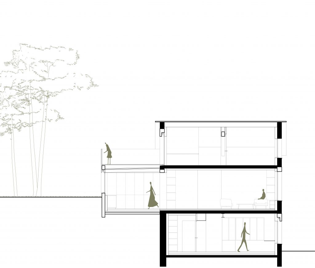 Au 1er étage, au niveau du jardin, le niveau des pièces de vie nécessite d’être agrandi. Une extension est accolée au pignon Ouest de la maison. Elle contient la cuisine, lovée dans le terrain, pour s’insérer harmonieusement dans le site.
